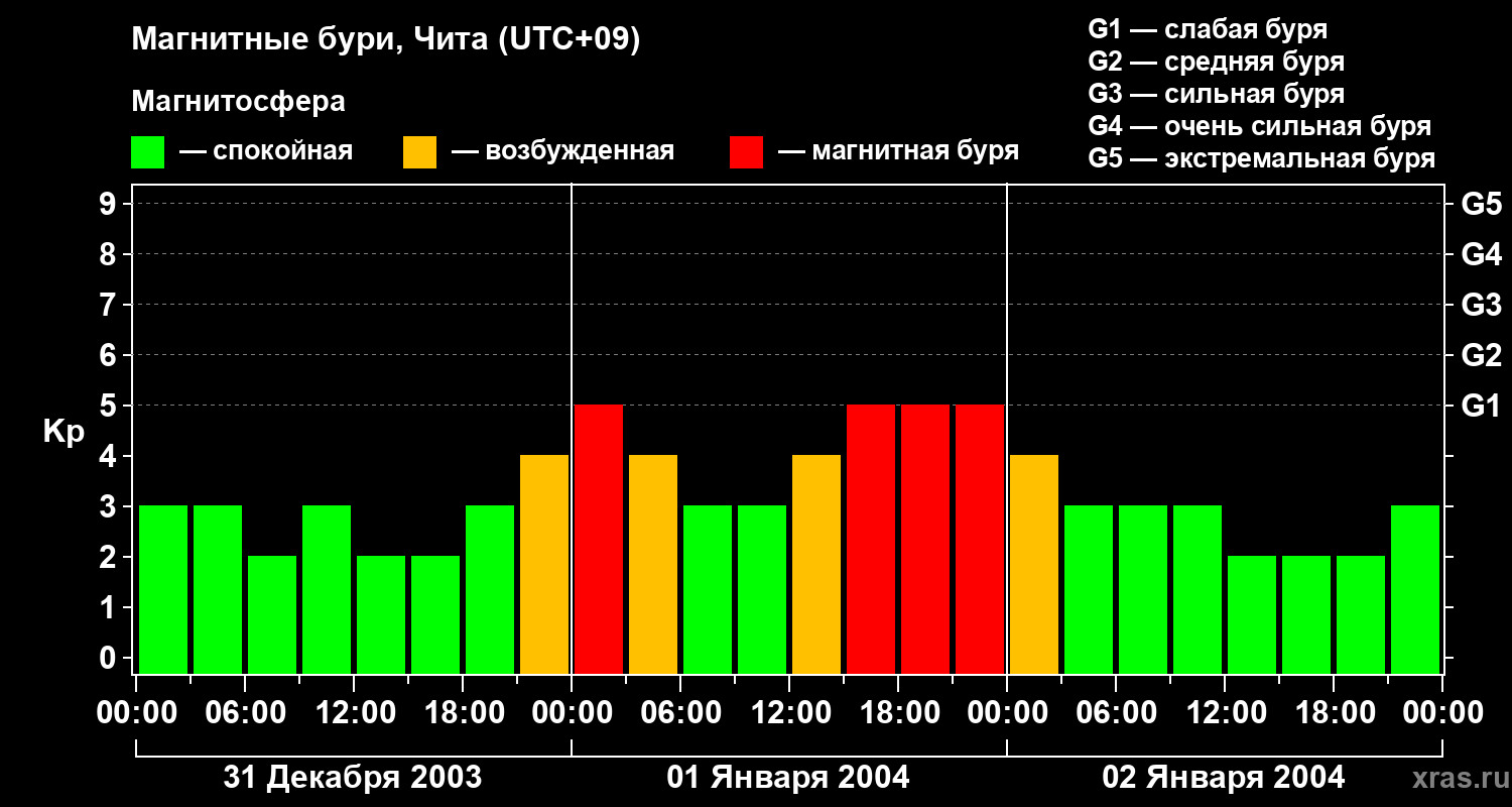 Изменения геомагнитного индекса Kp с 31 декабря 2003 года по 2 января 2004 года для средних широт