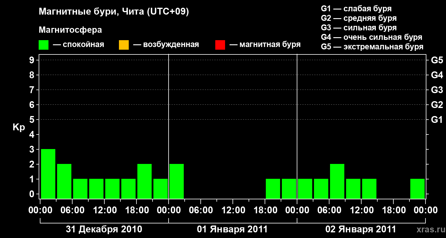 Изменения геомагнитного индекса Kp с 31 декабря 2010 года по 2 января 2011 года для средних широт