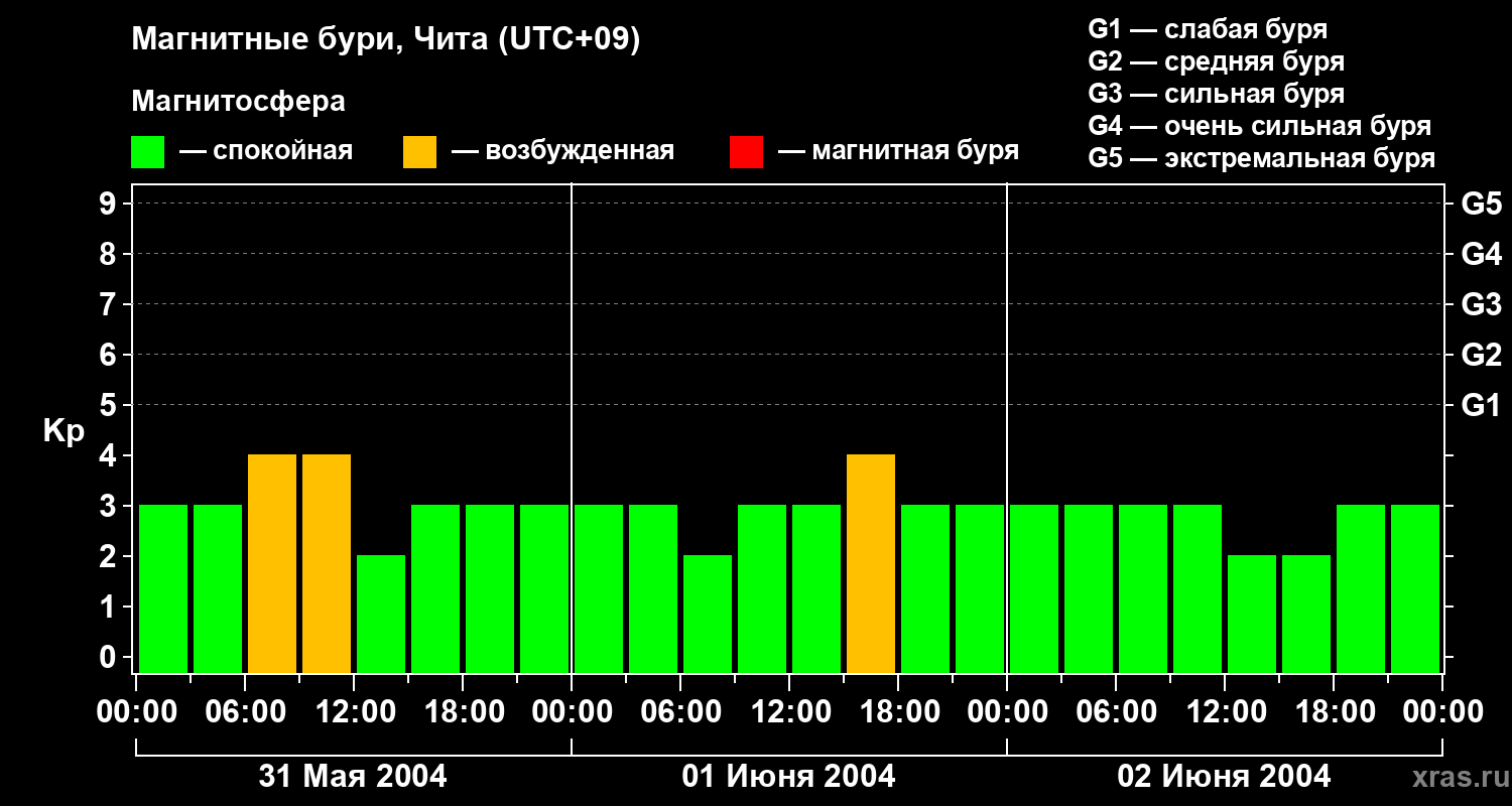 Изменения геомагнитного индекса Kp с 31 мая по 2 июня 2004 года для средних широт