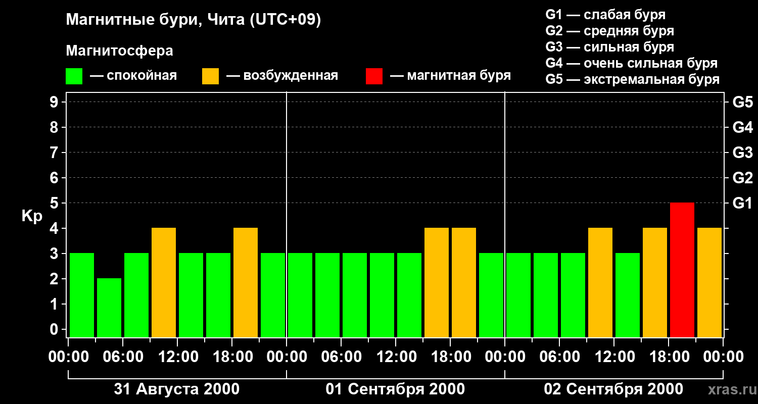 Изменения геомагнитного индекса Kp с 31 августа по 2 сентября 2000 года для средних широт