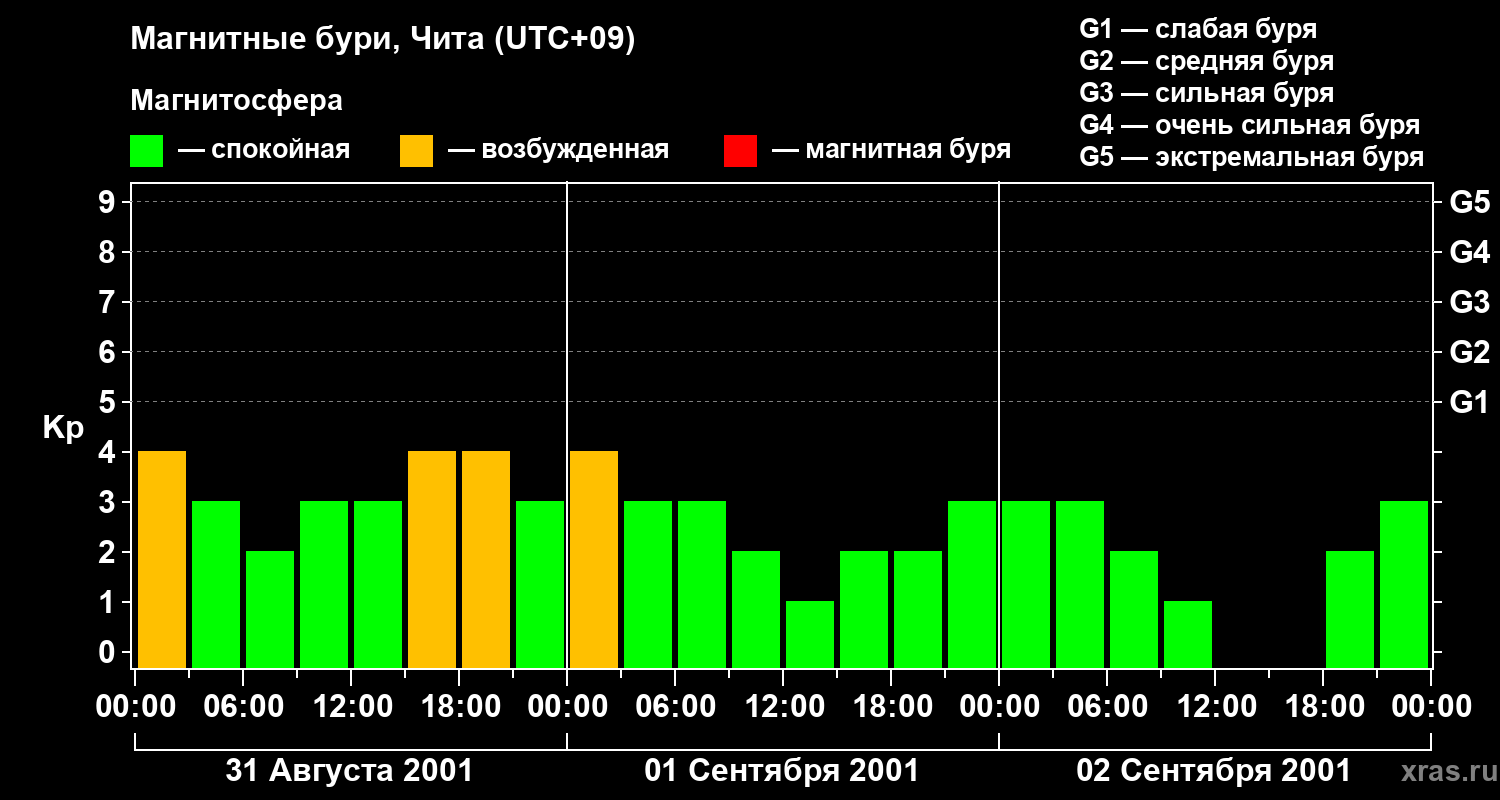 Изменения геомагнитного индекса Kp с 31 августа по 2 сентября 2001 года для средних широт
