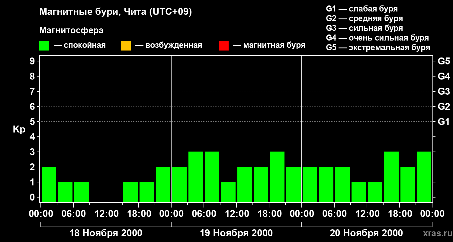 Изменения геомагнитного индекса Kp с 18 по 20 ноября 2000 года для средних широт