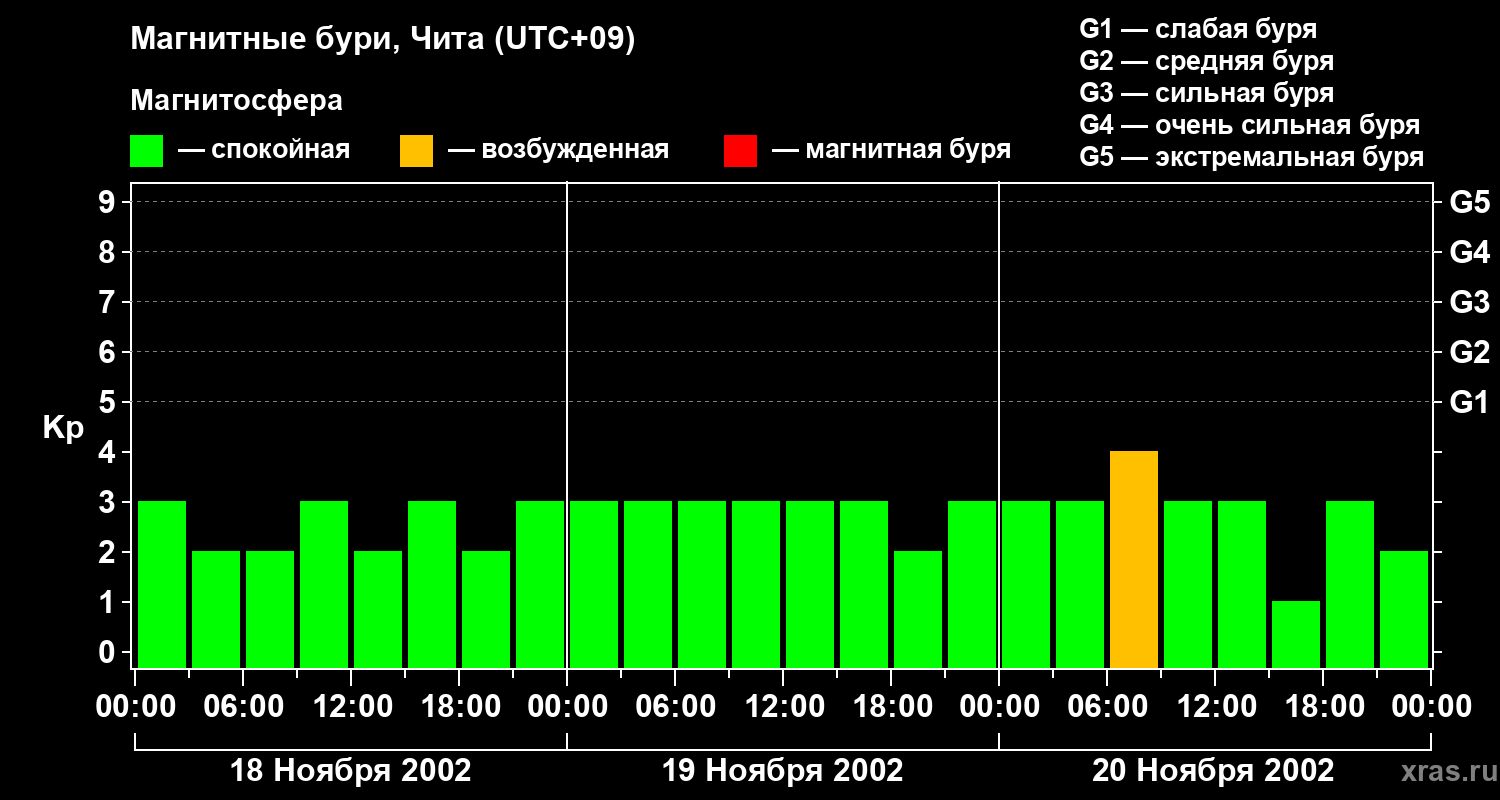 Изменения геомагнитного индекса Kp с 18 по 20 ноября 2002 года для средних широт