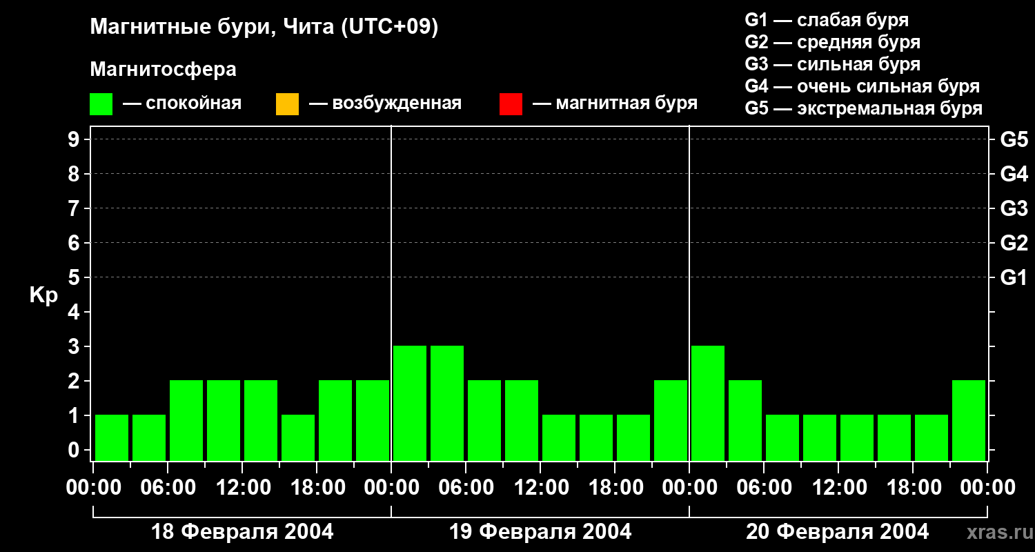Изменения геомагнитного индекса Kp с 18 по 20 февраля 2004 года для средних широт