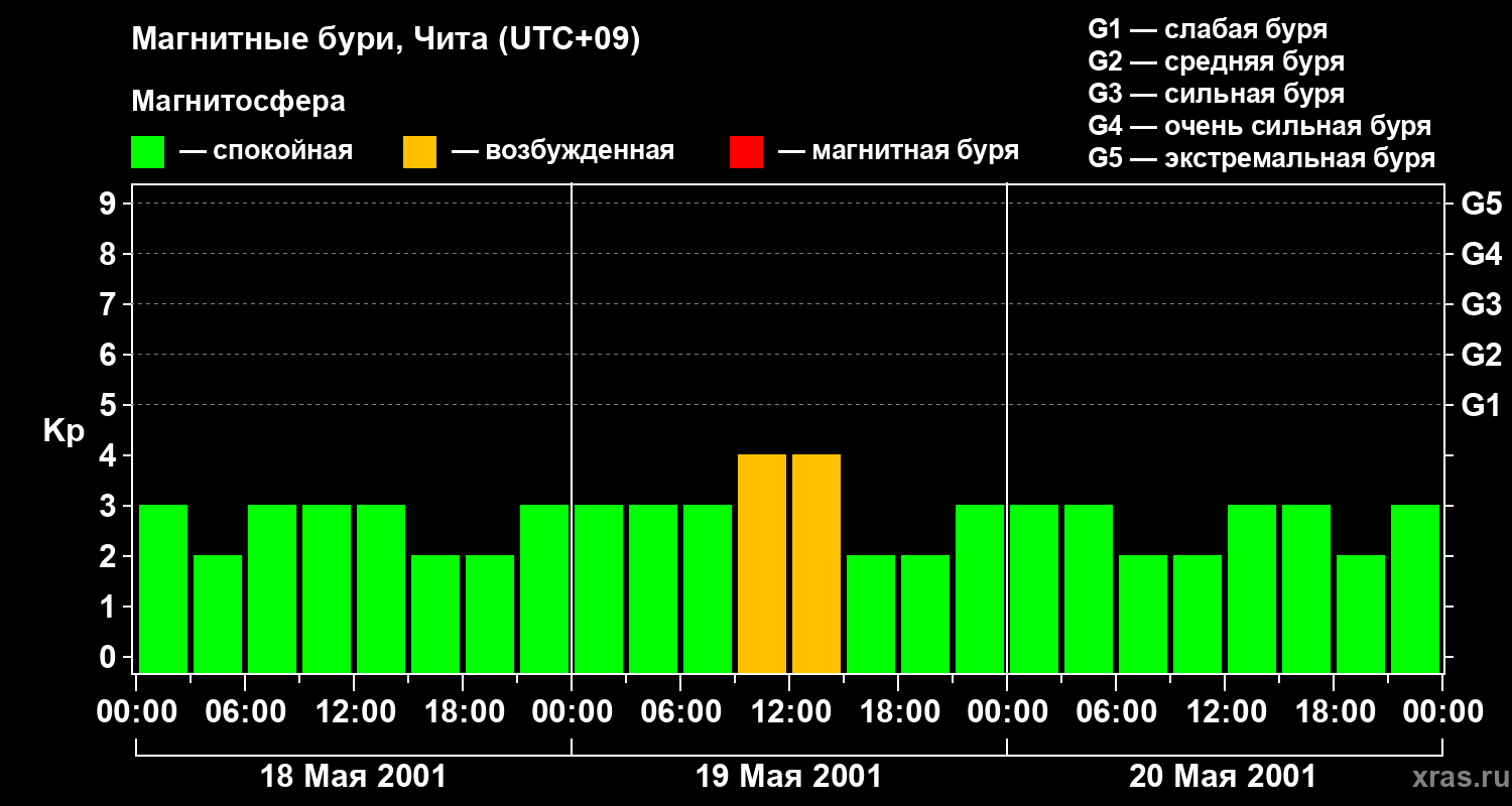 Изменения геомагнитного индекса Kp с 18 по 20 мая 2001 года для средних широт