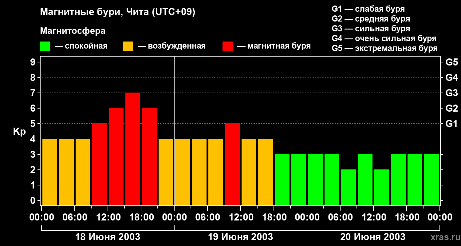 Изменения геомагнитного индекса Kp с 18 по 20 июня 2003 года для средних широт