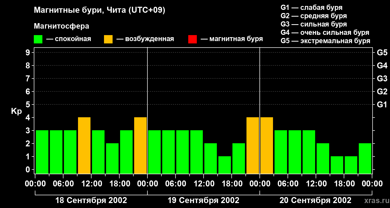 Изменения геомагнитного индекса Kp с 18 по 20 сентября 2002 года для средних широт
