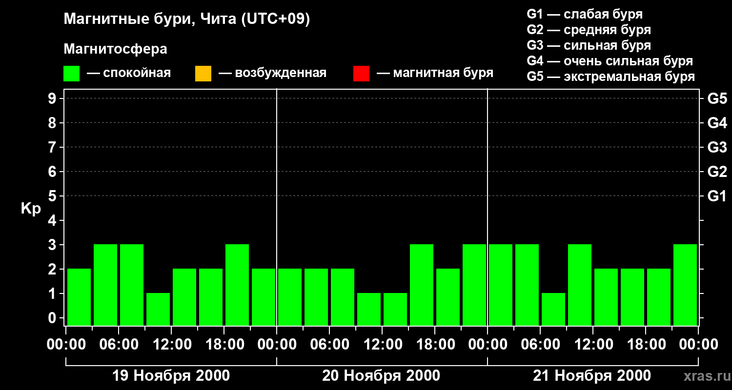 Изменения геомагнитного индекса Kp с 19 по 21 ноября 2000 года для средних широт