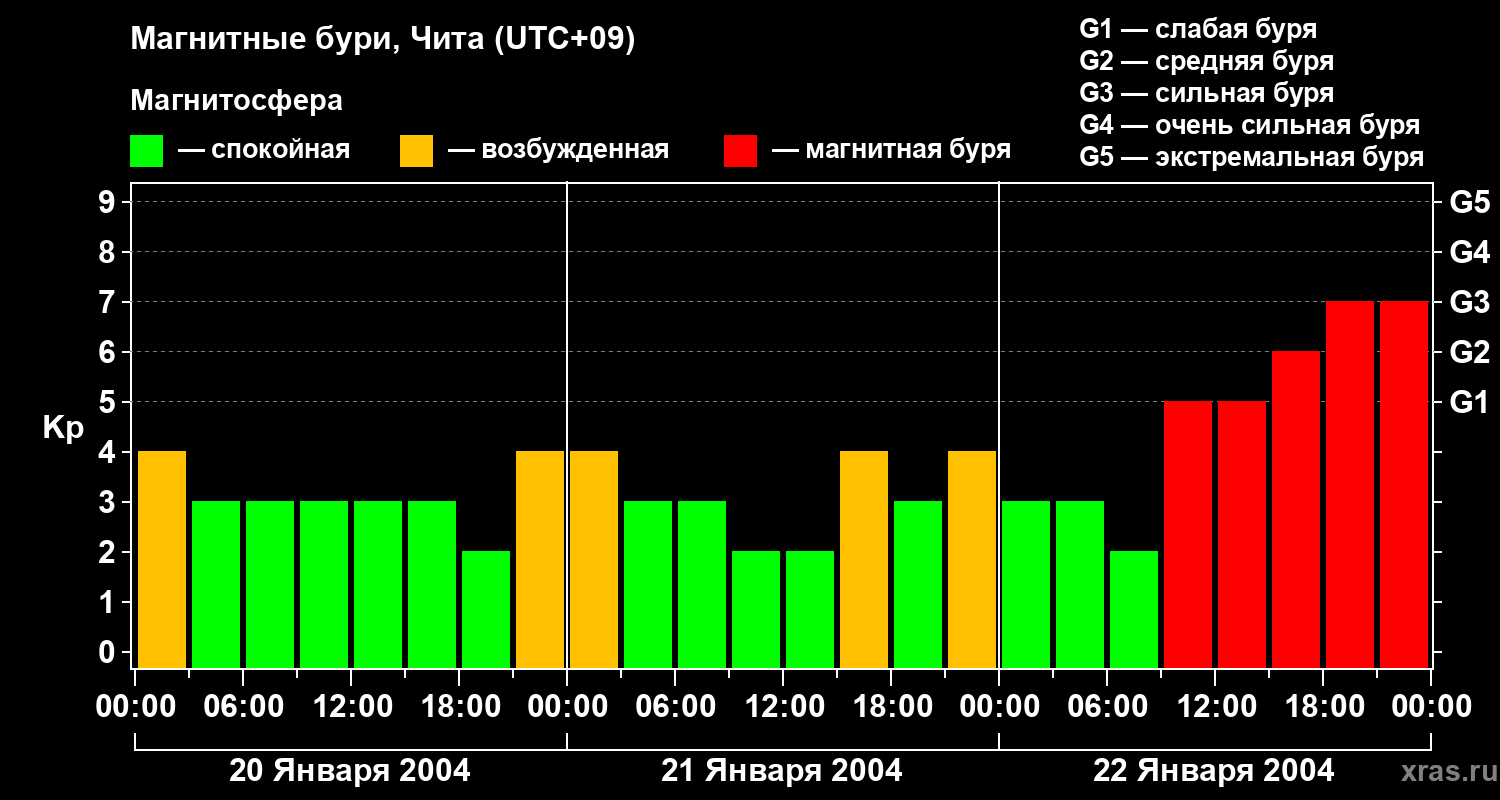 Изменения геомагнитного индекса Kp с 20 по 22 января 2004 года для средних широт