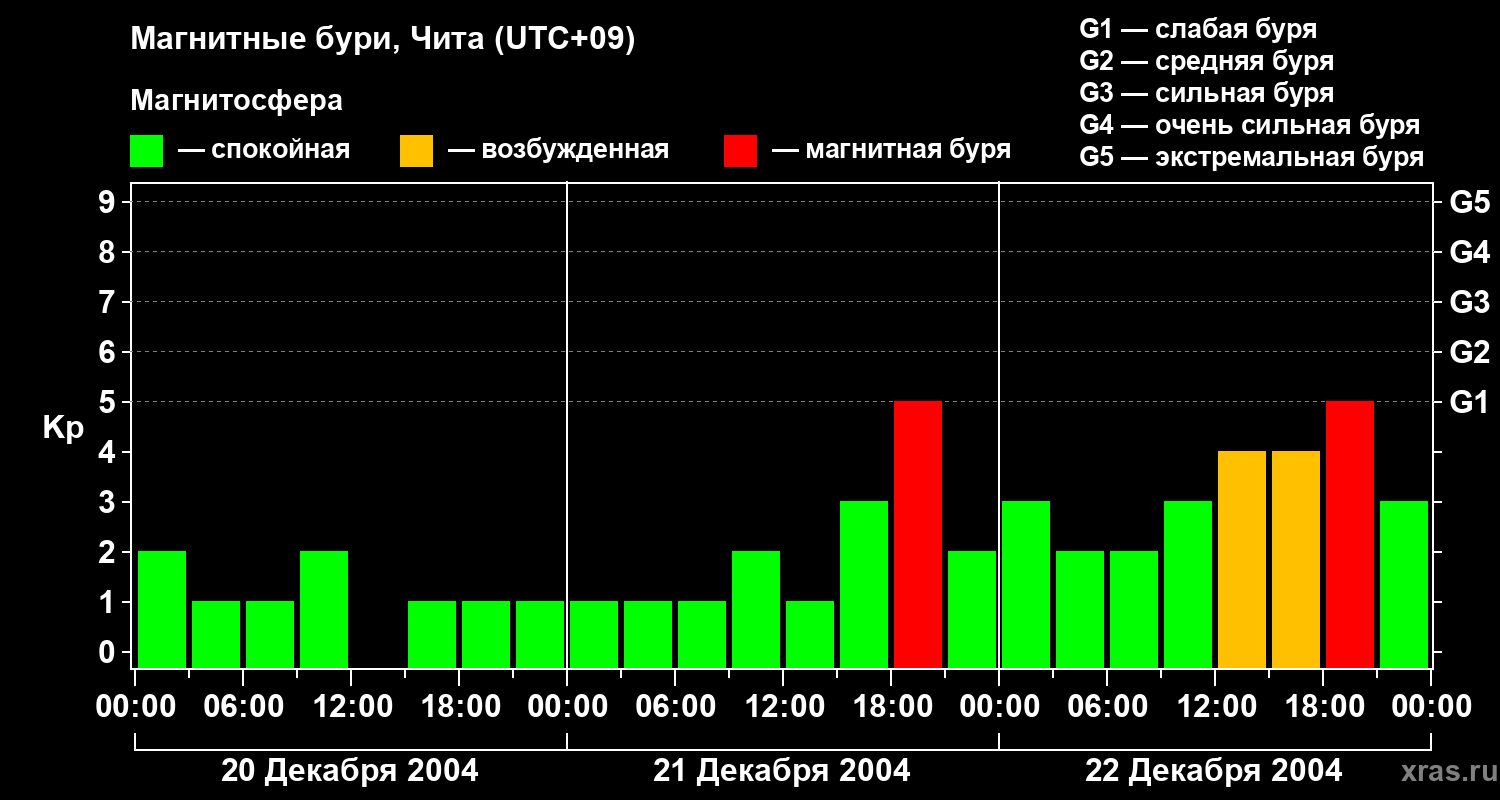 Изменения геомагнитного индекса Kp с 20 по 22 декабря 2004 года для средних широт