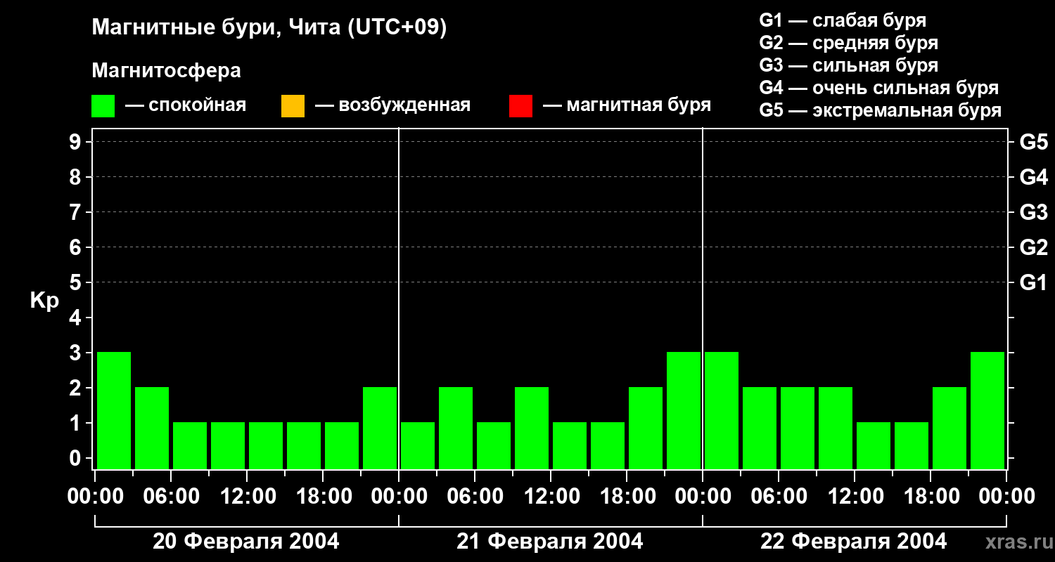 Изменения геомагнитного индекса Kp с 20 по 22 февраля 2004 года для средних широт