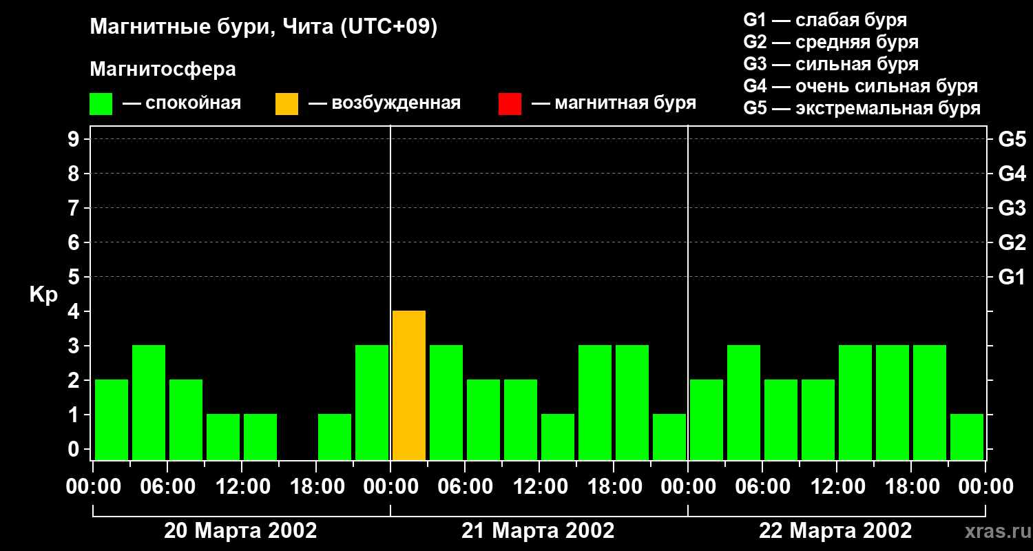Изменения геомагнитного индекса Kp с 20 по 22 марта 2002 года для средних широт