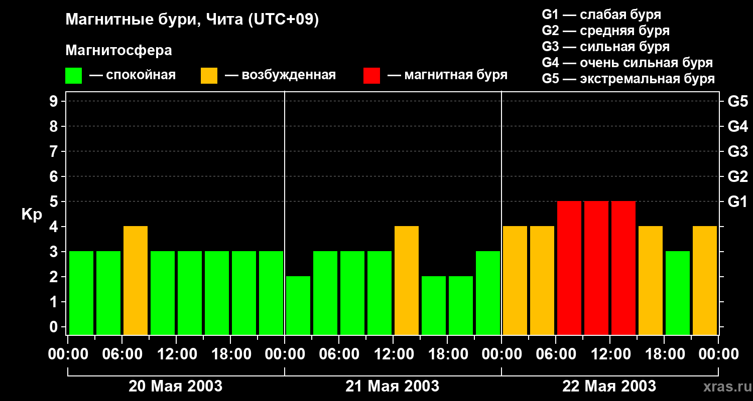Изменения геомагнитного индекса Kp с 20 по 22 мая 2003 года для средних широт