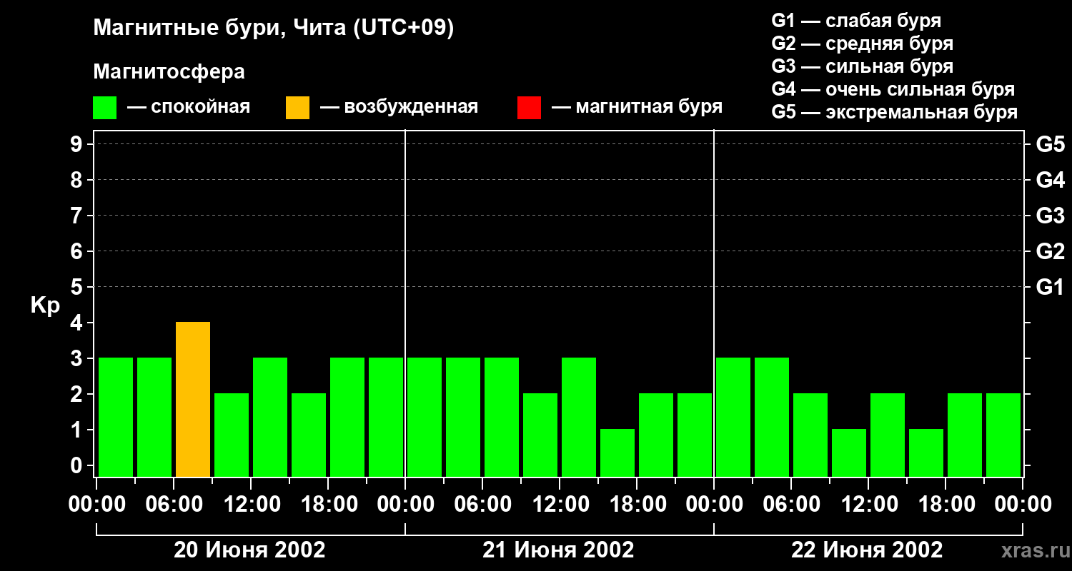 Изменения геомагнитного индекса Kp с 20 по 22 июня 2002 года для средних широт