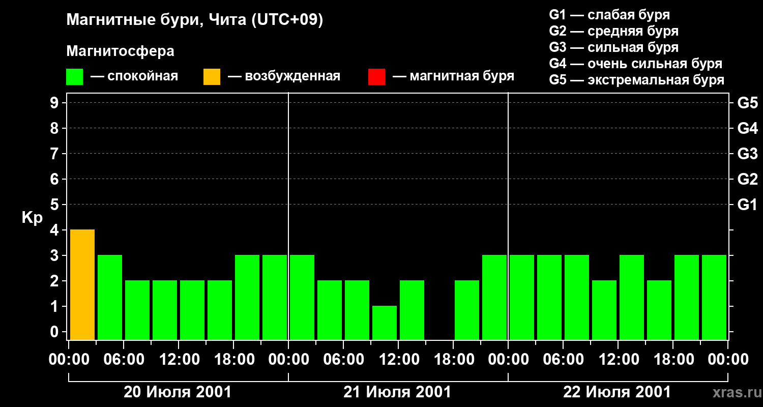 Изменения геомагнитного индекса Kp с 20 по 22 июля 2001 года для средних широт