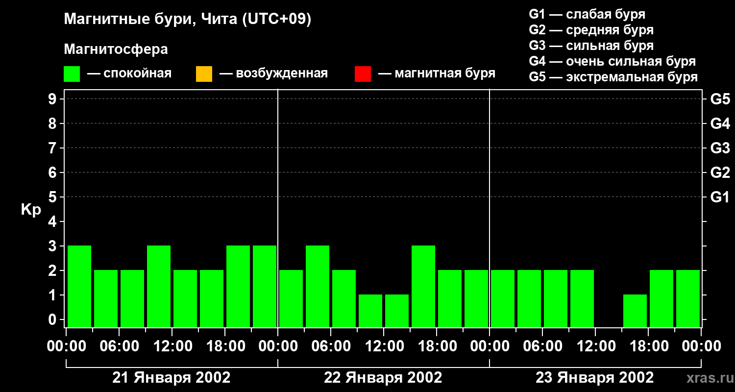 Изменения геомагнитного индекса Kp с 21 по 23 января 2002 года для средних широт