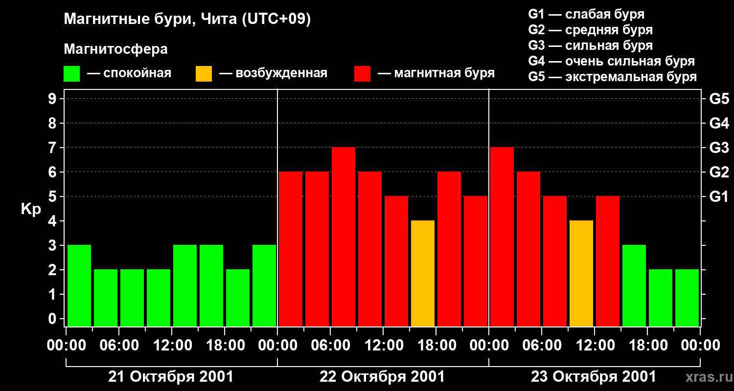 Изменения геомагнитного индекса Kp с 21 по 23 октября 2001 года для средних широт