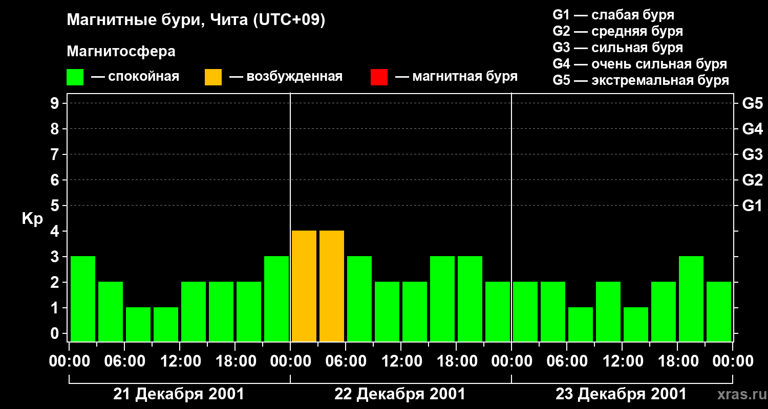 Изменения геомагнитного индекса Kp с 21 по 23 декабря 2001 года для средних широт