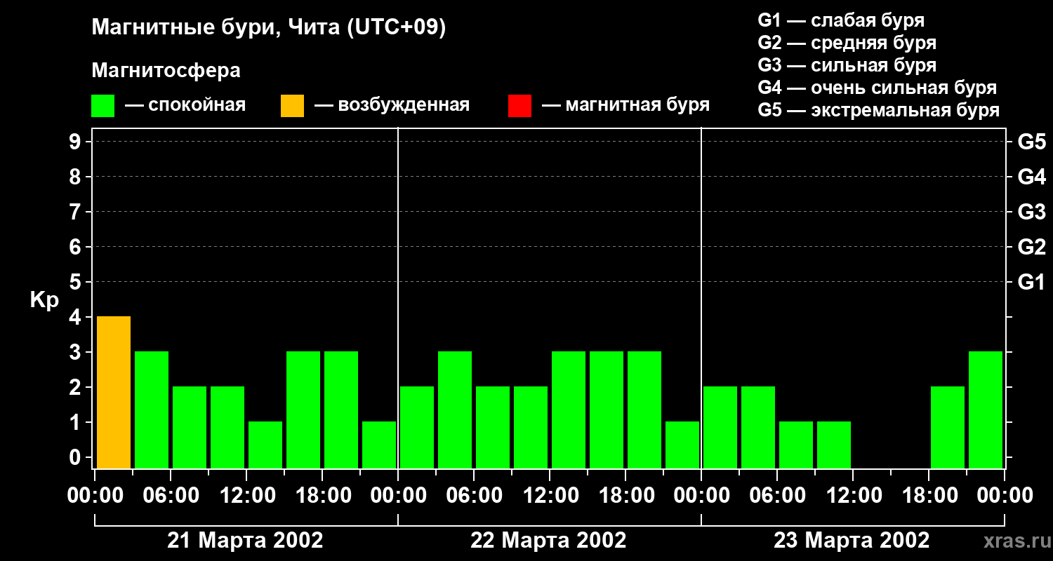 Изменения геомагнитного индекса Kp с 21 по 23 марта 2002 года для средних широт