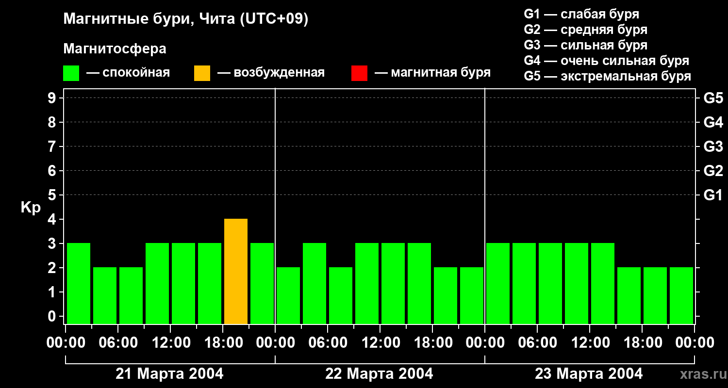 Изменения геомагнитного индекса Kp с 21 по 23 марта 2004 года для средних широт