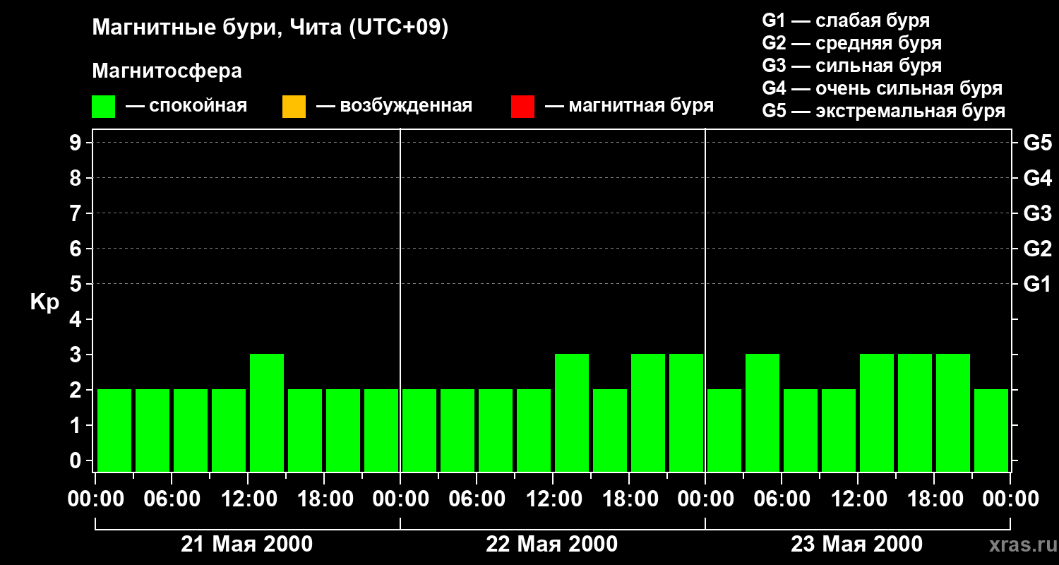 Изменения геомагнитного индекса Kp с 21 по 23 мая 2000 года для средних широт