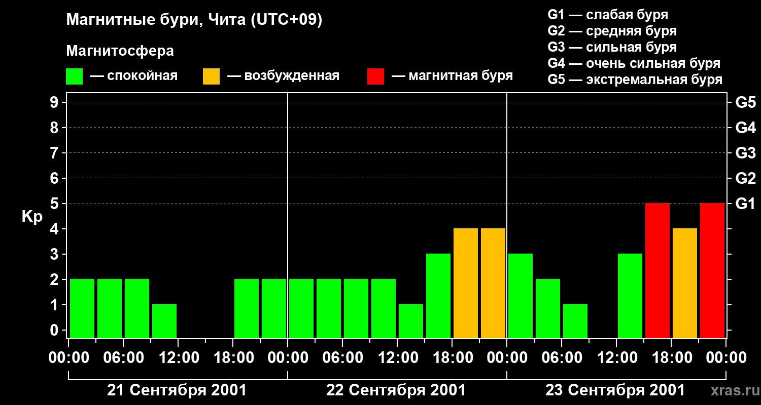 Изменения геомагнитного индекса Kp с 21 по 23 сентября 2001 года для средних широт