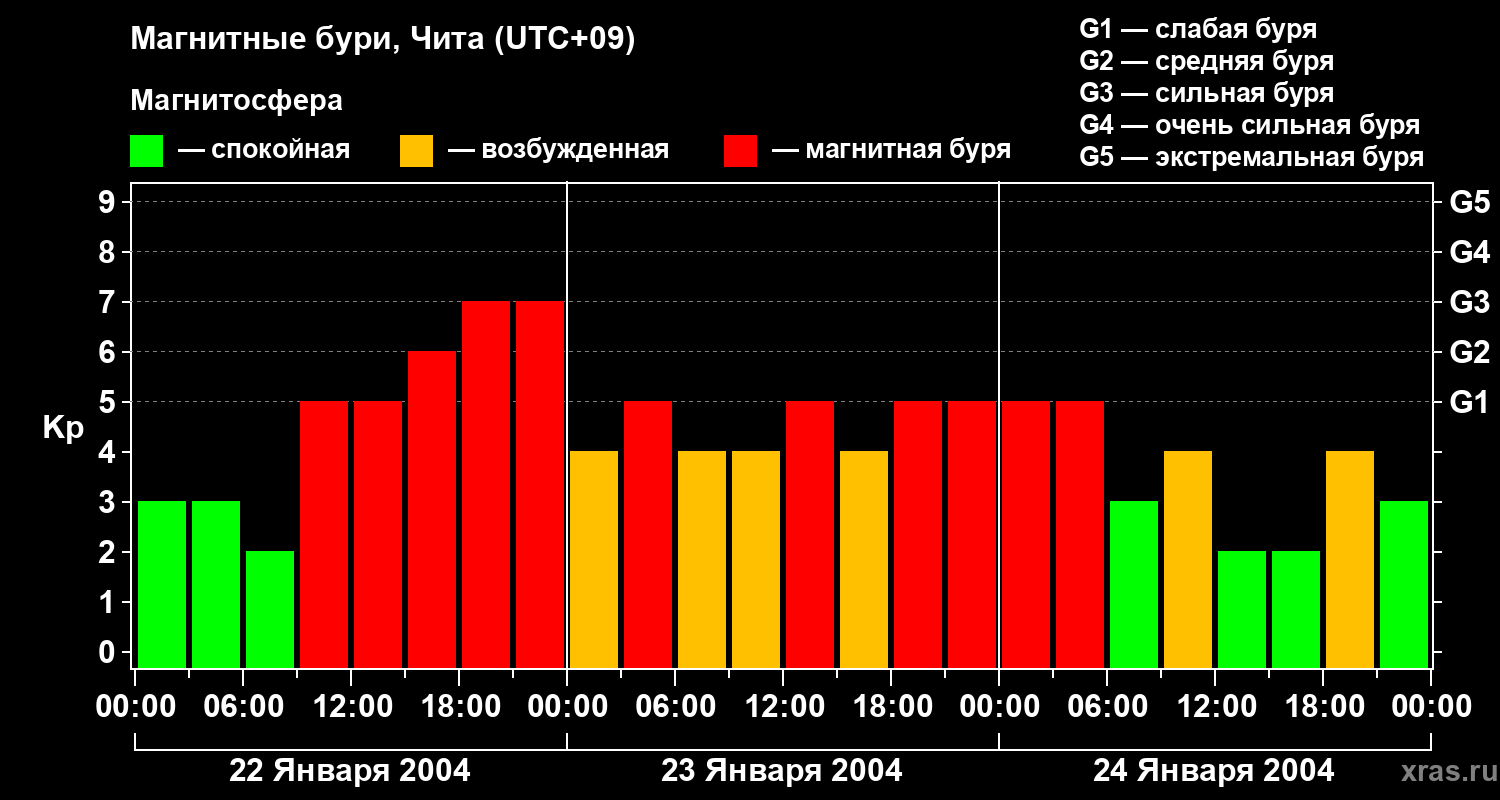 Изменения геомагнитного индекса Kp с 22 по 24 января 2004 года для средних широт