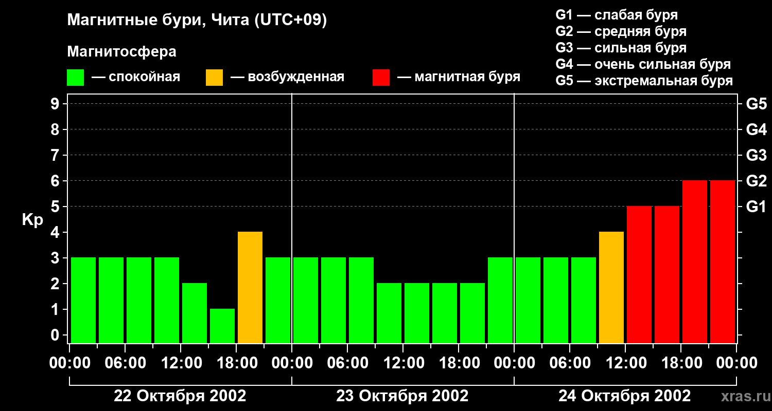 Изменения геомагнитного индекса Kp с 22 по 24 октября 2002 года для средних широт