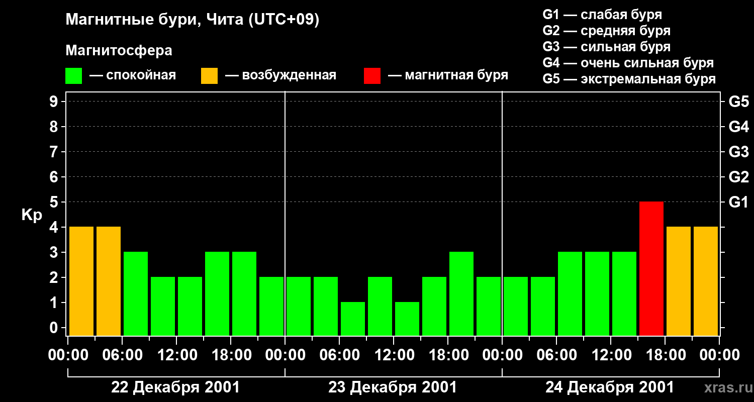 Изменения геомагнитного индекса Kp с 22 по 24 декабря 2001 года для средних широт