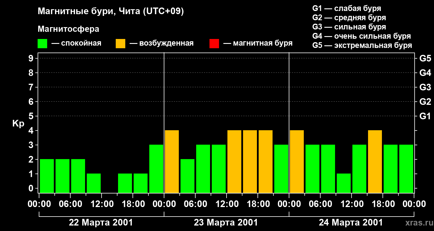 Изменения геомагнитного индекса Kp с 22 по 24 марта 2001 года для средних широт
