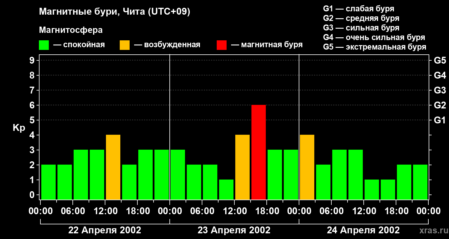 Изменения геомагнитного индекса Kp с 22 по 24 апреля 2002 года для средних широт