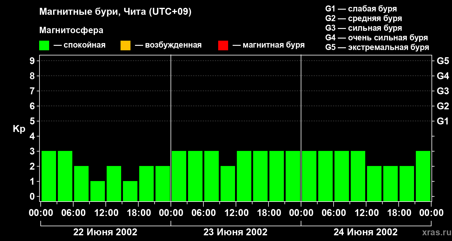 Изменения геомагнитного индекса Kp с 22 по 24 июня 2002 года для средних широт