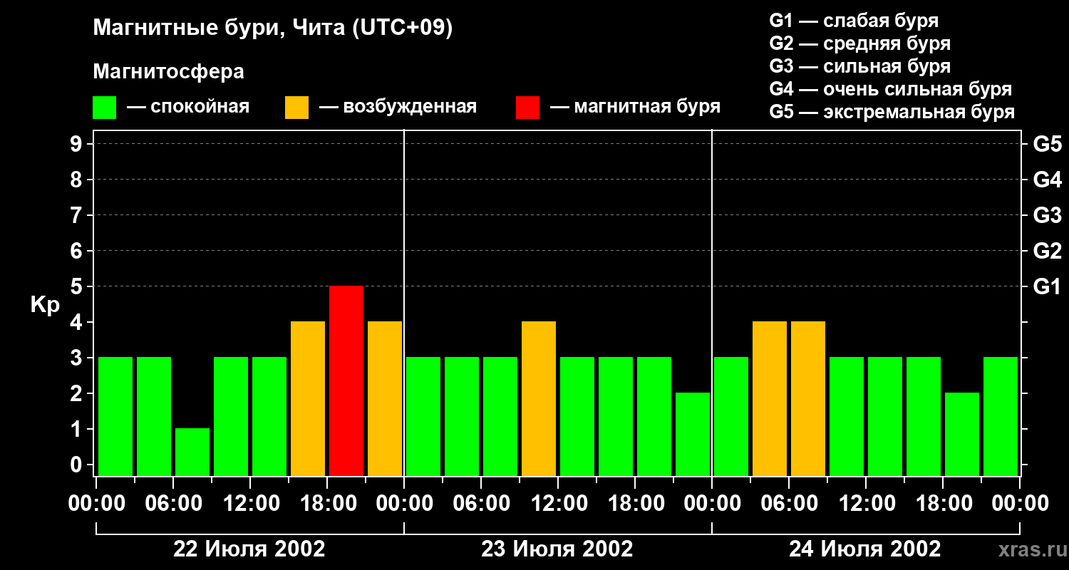Изменения геомагнитного индекса Kp с 22 по 24 июля 2002 года для средних широт