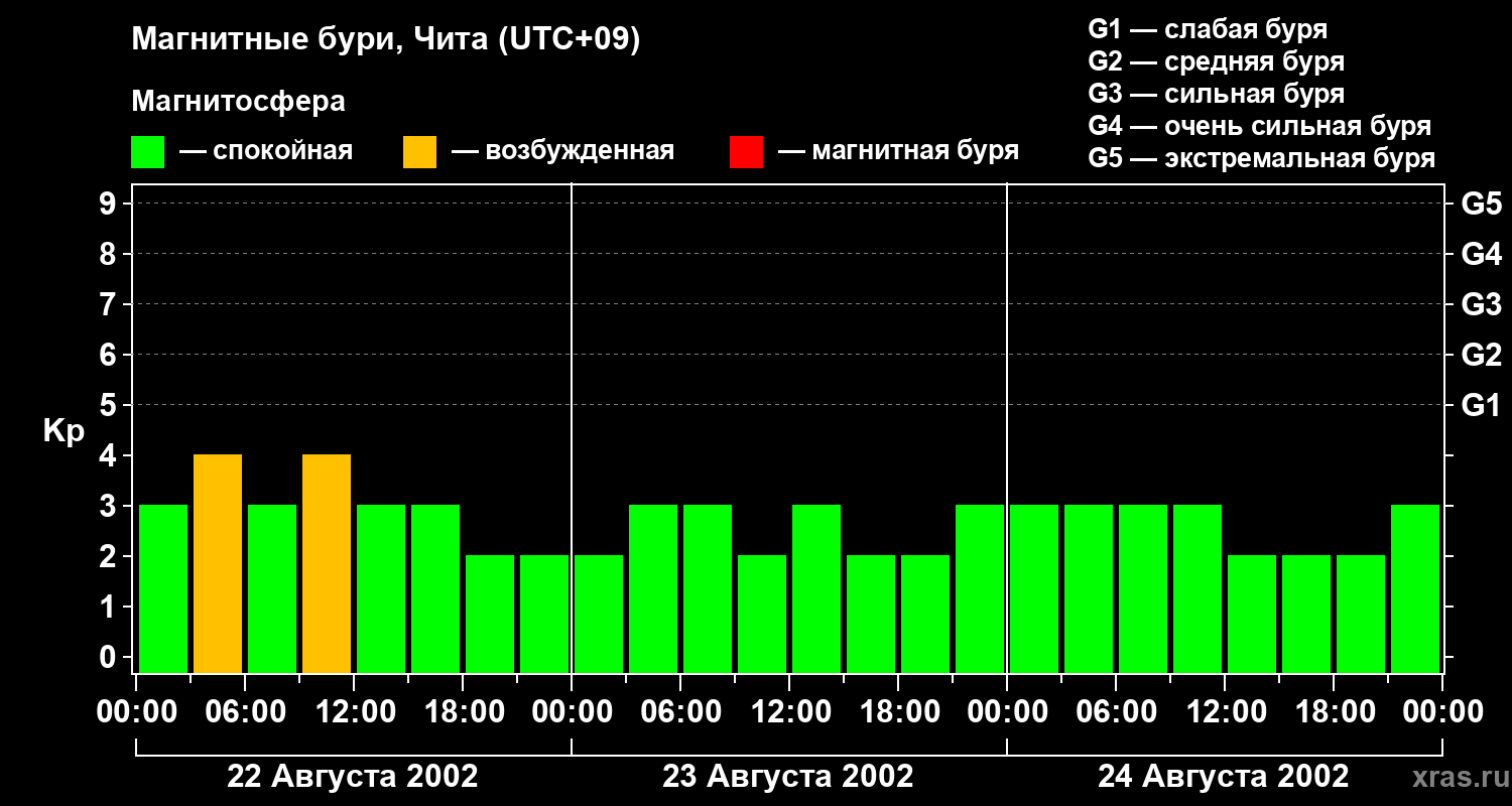 Изменения геомагнитного индекса Kp с 22 по 24 августа 2002 года для средних широт