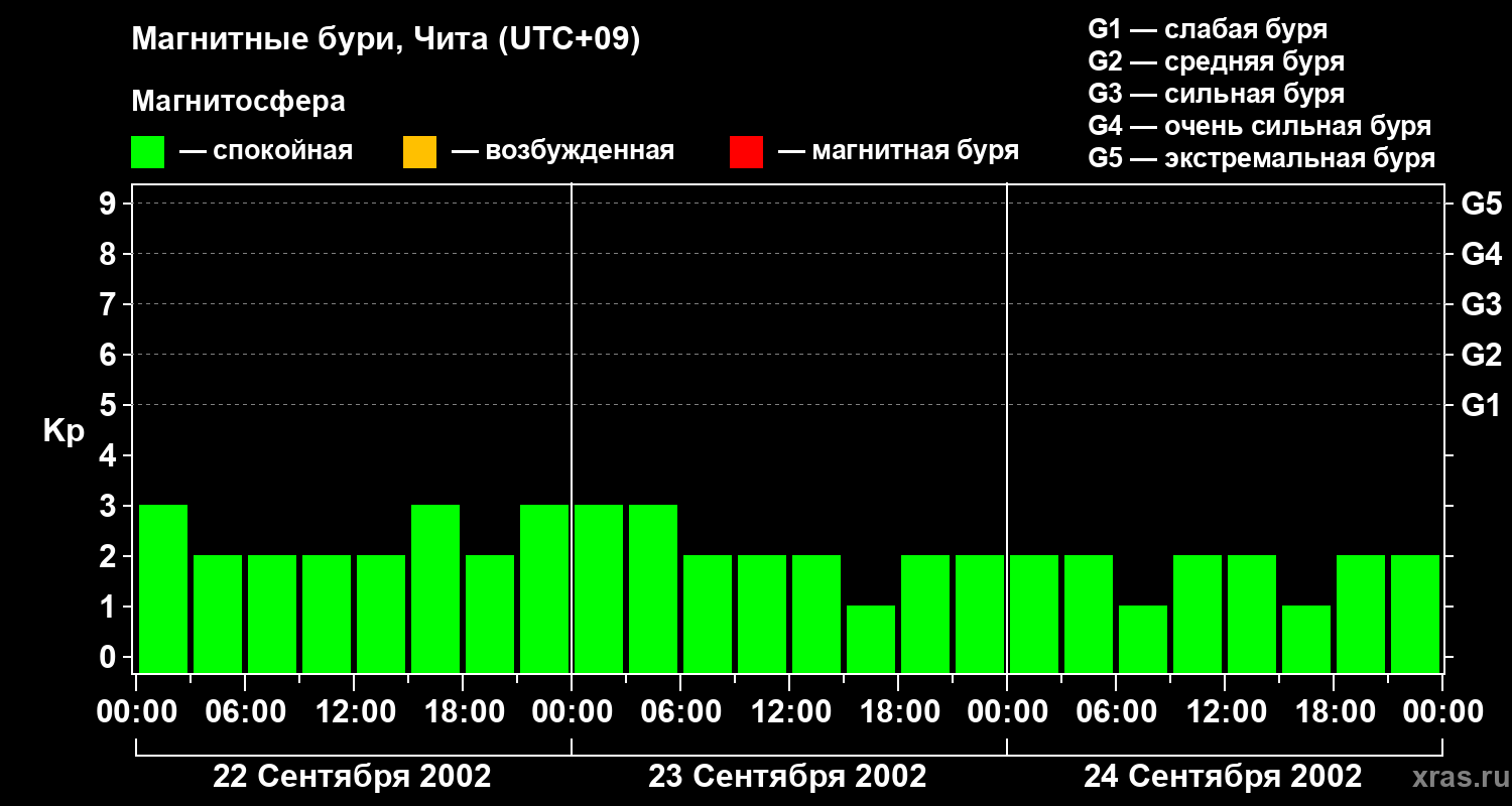Изменения геомагнитного индекса Kp с 22 по 24 сентября 2002 года для средних широт