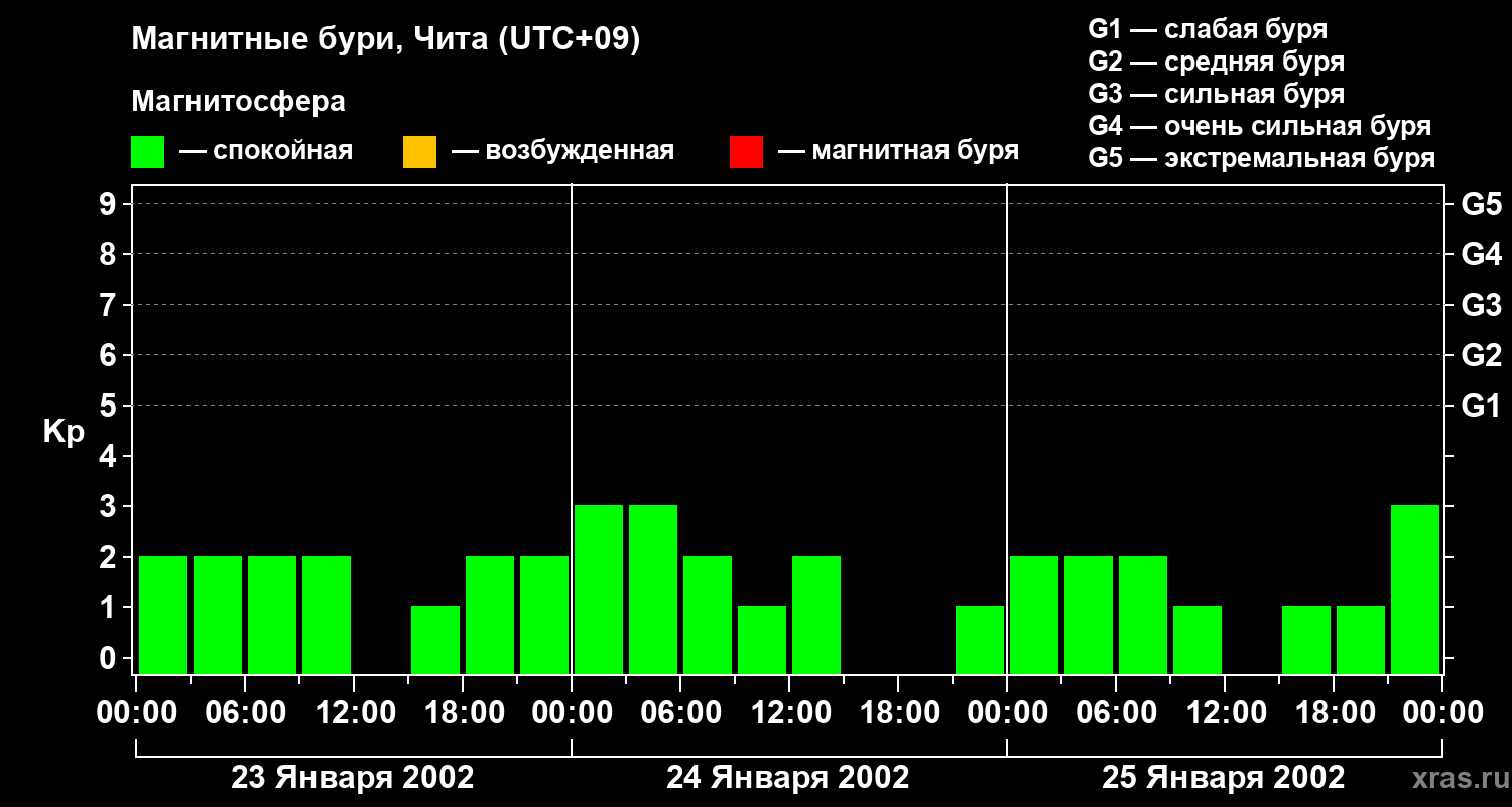 Изменения геомагнитного индекса Kp с 23 по 25 января 2002 года для средних широт