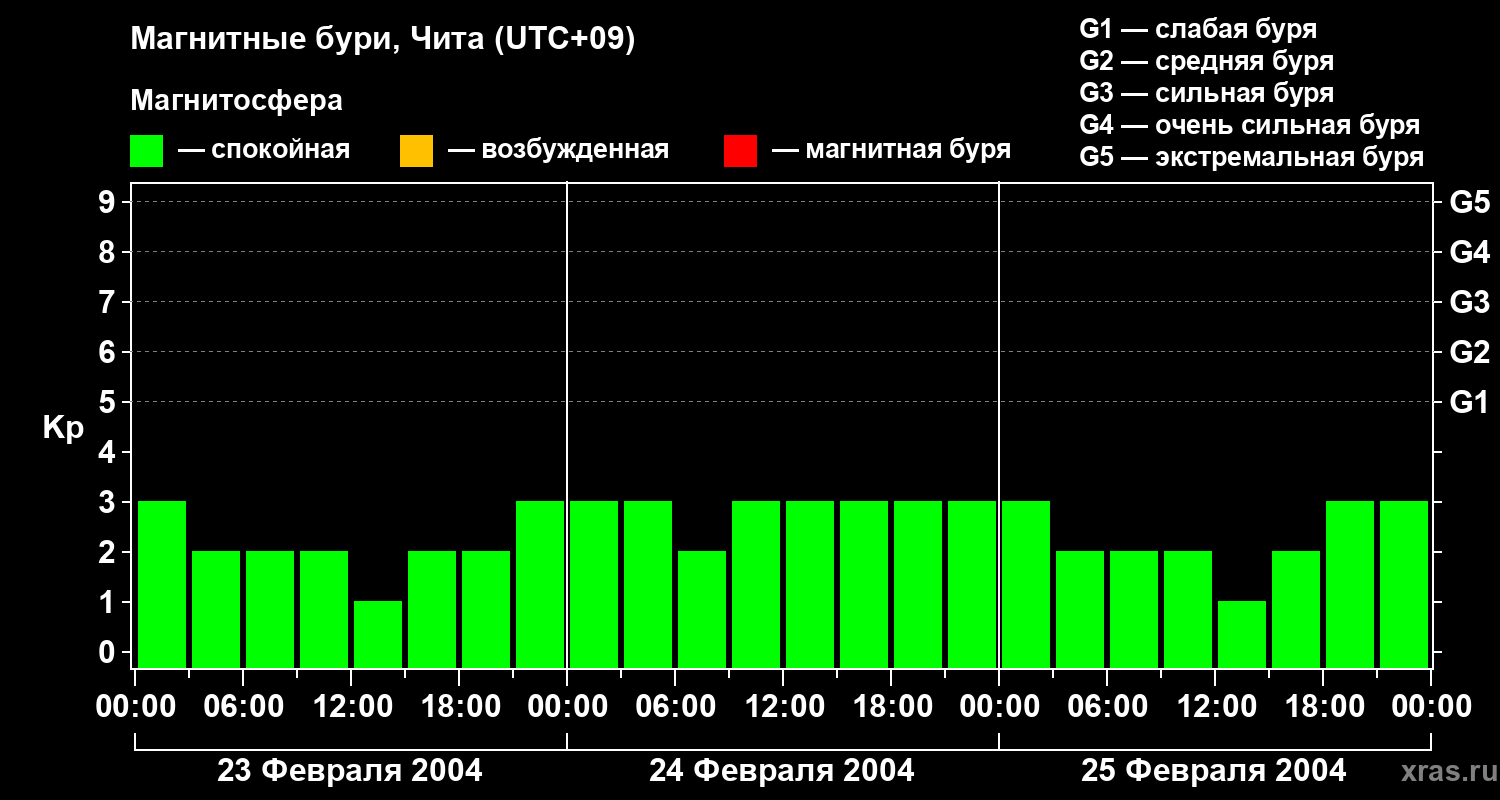 Изменения геомагнитного индекса Kp с 23 по 25 февраля 2004 года для средних широт