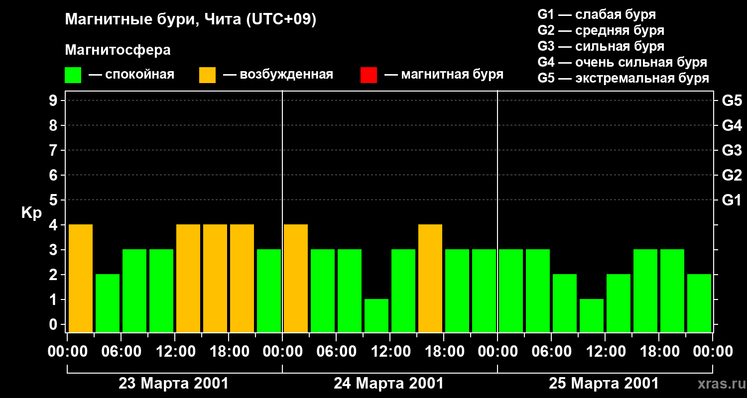 Изменения геомагнитного индекса Kp с 23 по 25 марта 2001 года для средних широт