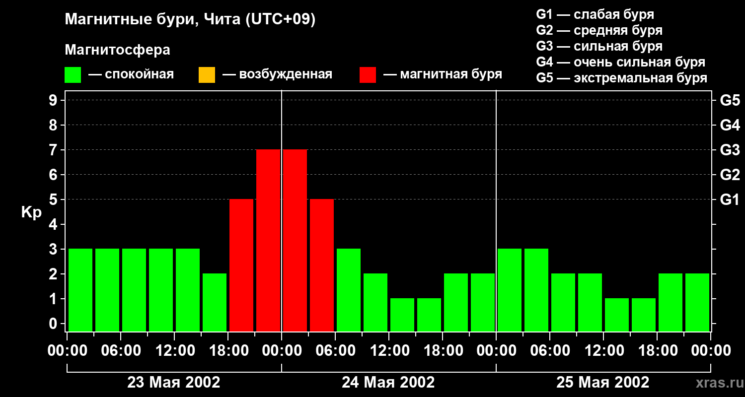 Изменения геомагнитного индекса Kp с 23 по 25 мая 2002 года для средних широт