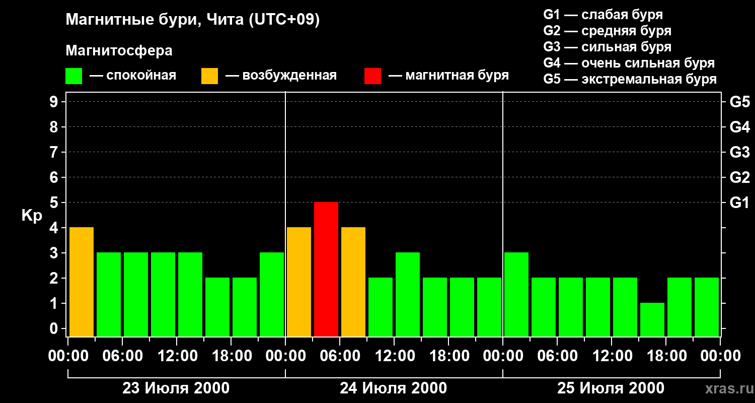 Изменения геомагнитного индекса Kp с 23 по 25 июля 2000 года для средних широт
