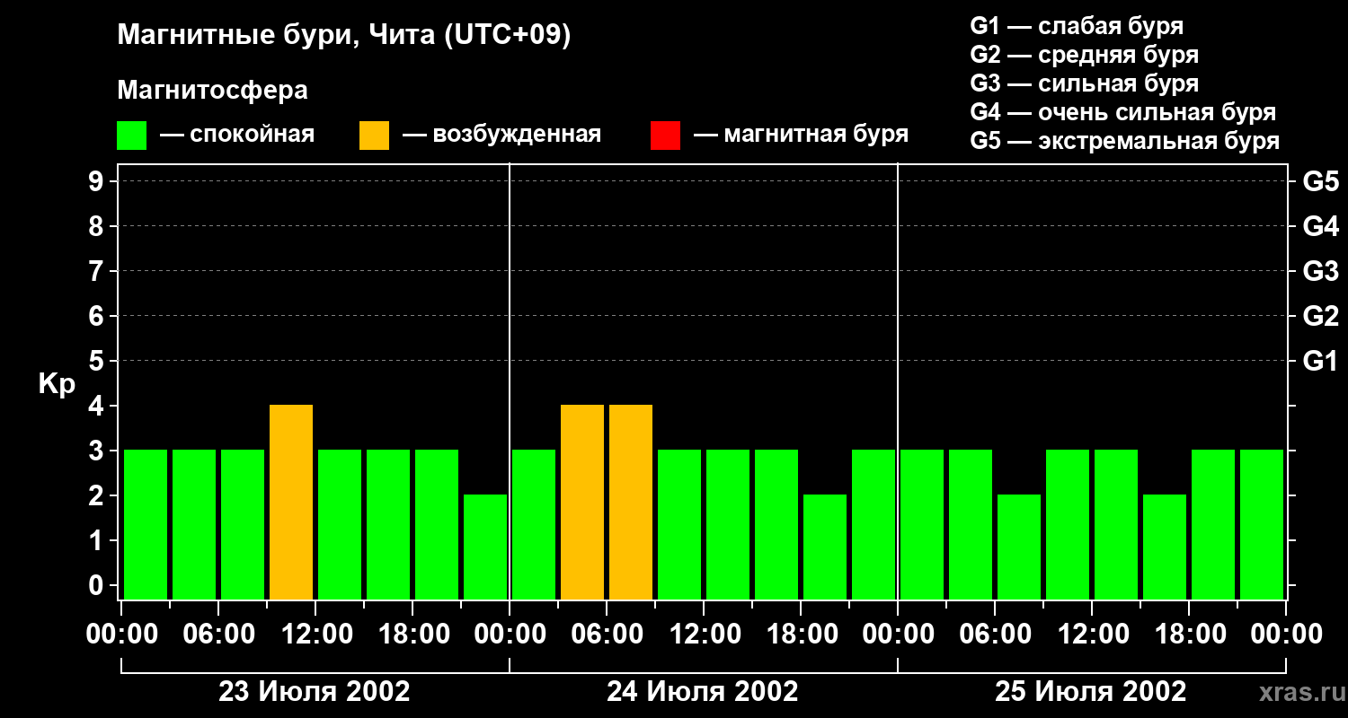 Изменения геомагнитного индекса Kp с 23 по 25 июля 2002 года для средних широт