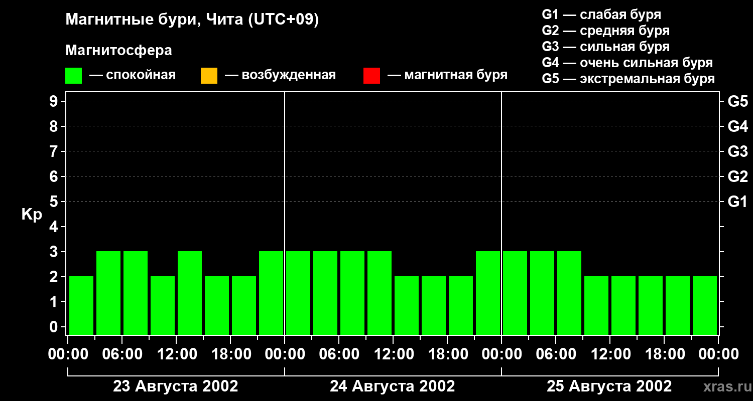 Изменения геомагнитного индекса Kp с 23 по 25 августа 2002 года для средних широт