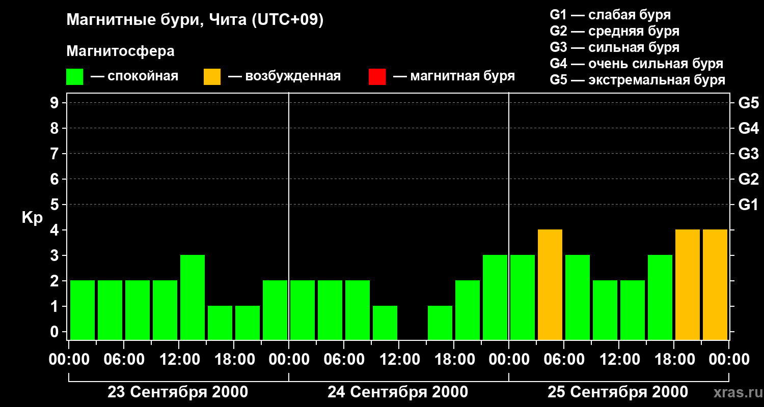 Изменения геомагнитного индекса Kp с 23 по 25 сентября 2000 года для средних широт