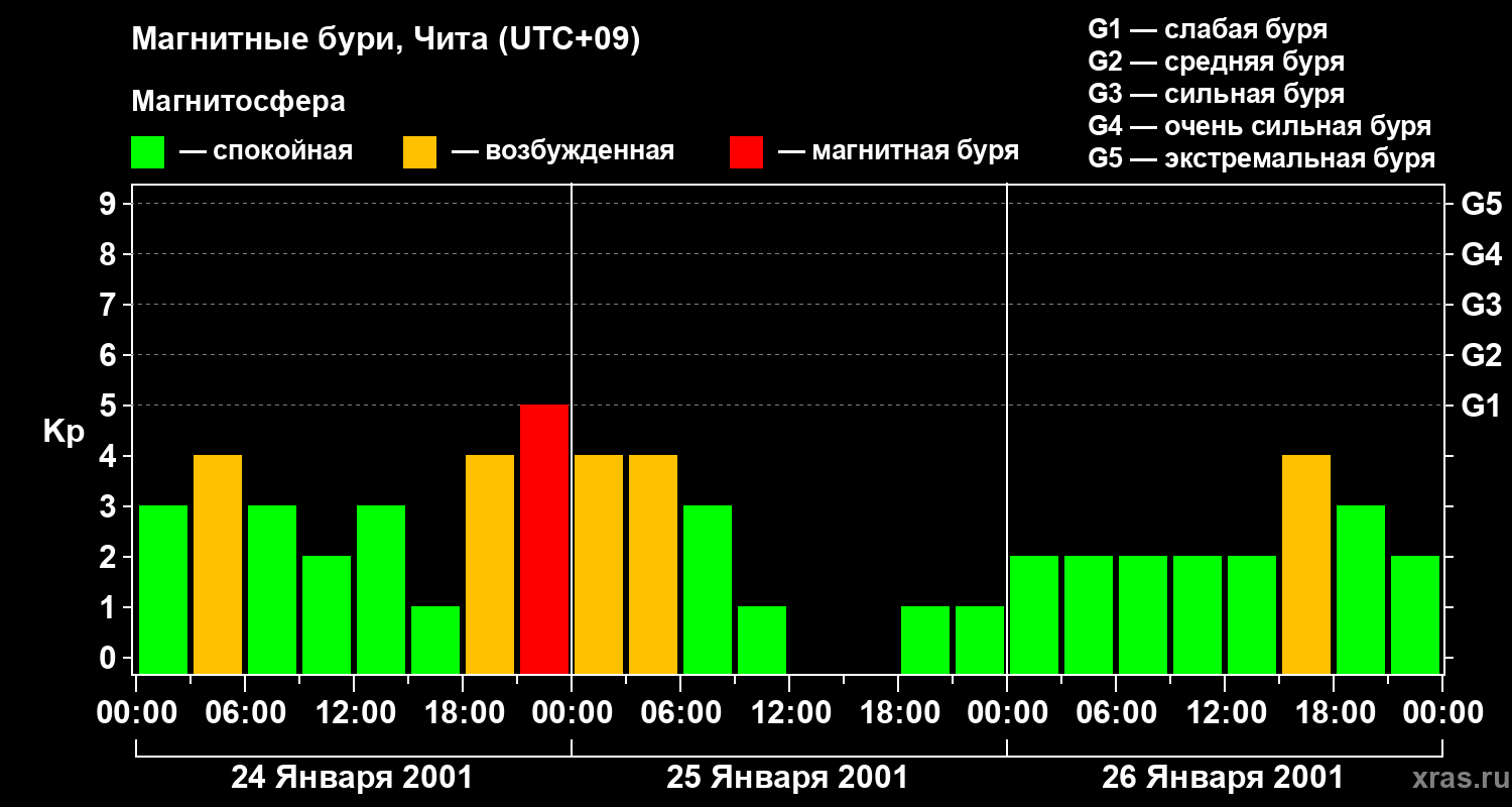 Изменения геомагнитного индекса Kp с 24 по 26 января 2001 года для средних широт