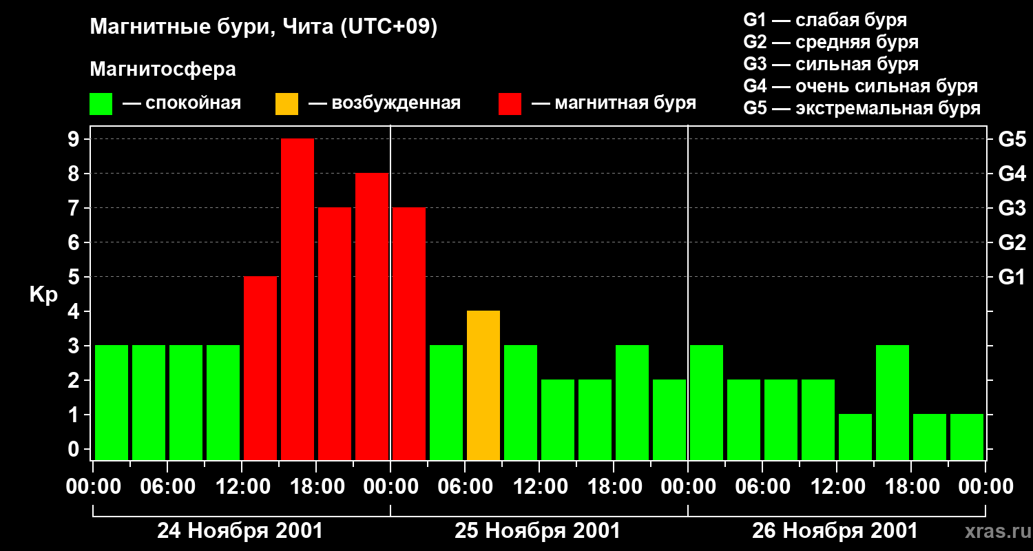 Изменения геомагнитного индекса Kp с 24 по 26 ноября 2001 года для средних широт