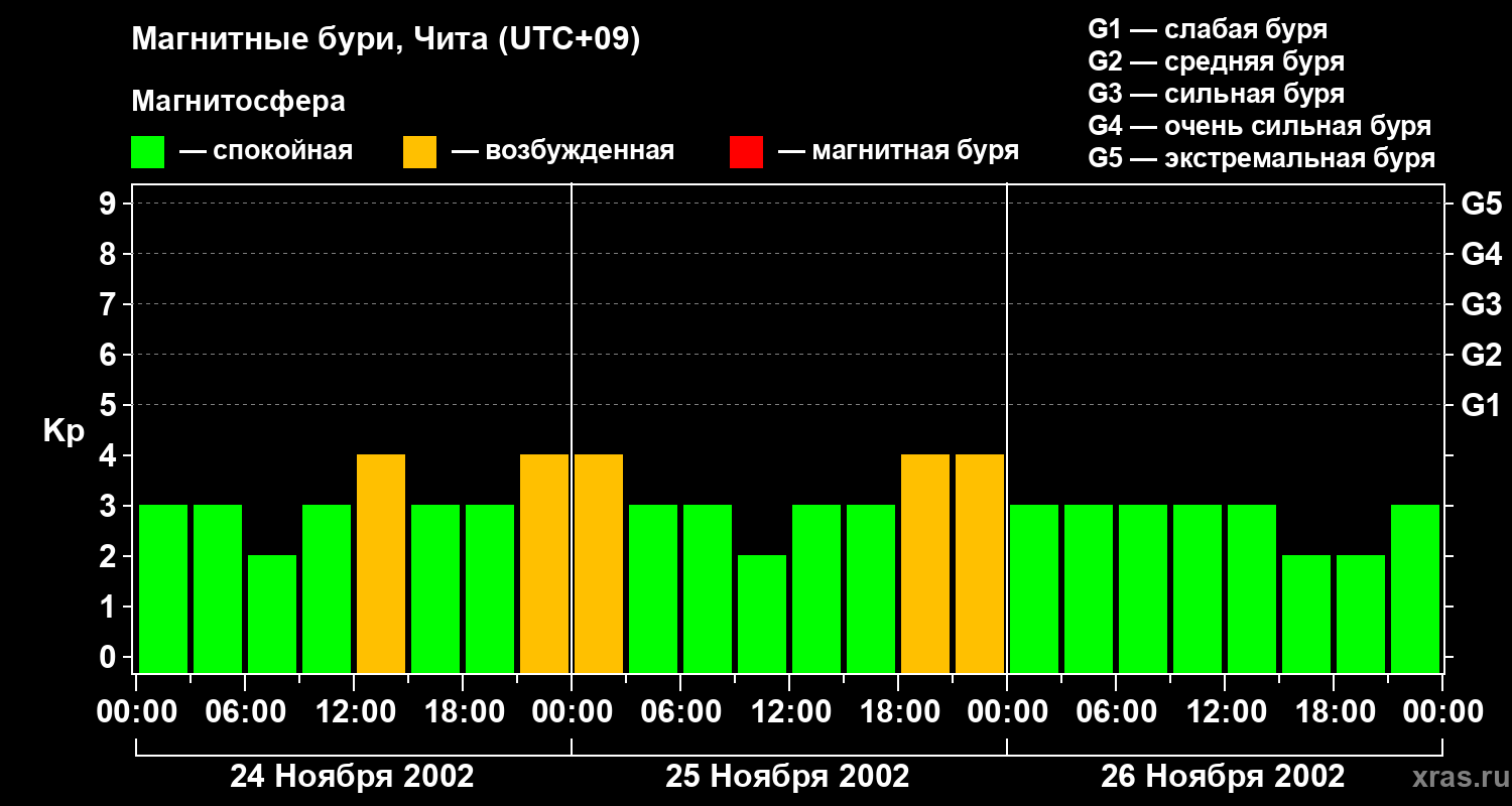 Изменения геомагнитного индекса Kp с 24 по 26 ноября 2002 года для средних широт