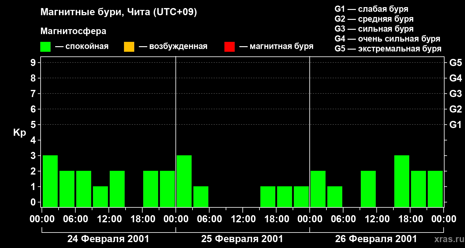 Изменения геомагнитного индекса Kp с 24 по 26 февраля 2001 года для средних широт