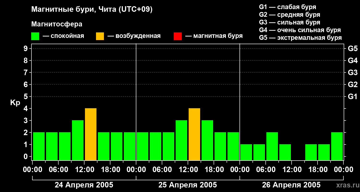 Изменения геомагнитного индекса Kp с 24 по 26 апреля 2005 года для средних широт