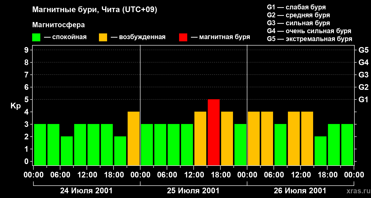 Изменения геомагнитного индекса Kp с 24 по 26 июля 2001 года для средних широт