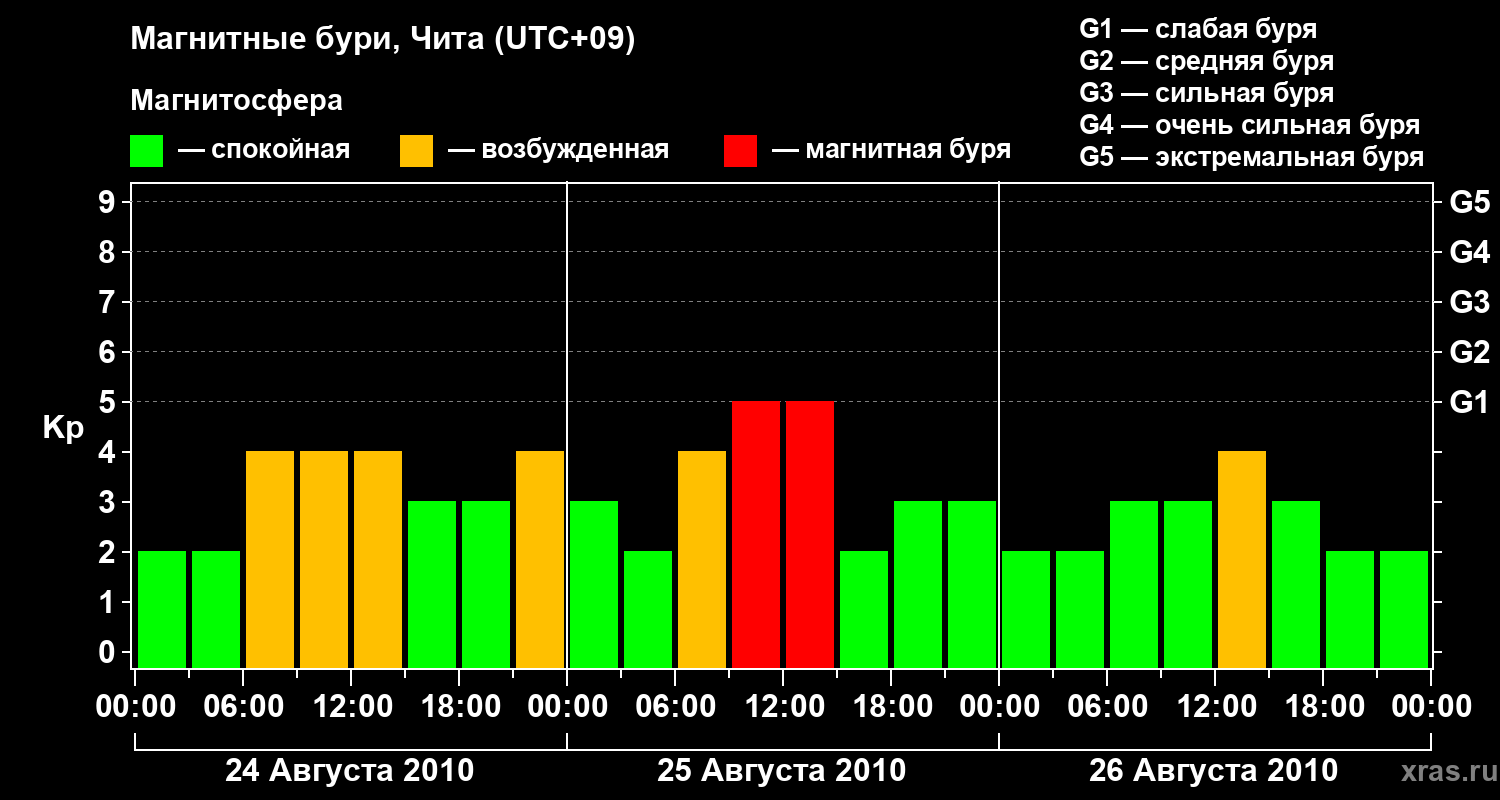 Изменения геомагнитного индекса Kp с 24 по 26 августа 2010 года для средних широт